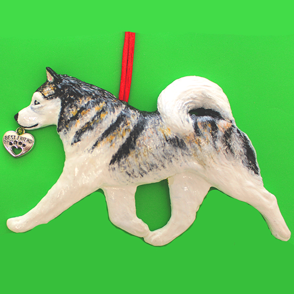 Alaskan Malamute in side view gaiting Christmas Ornament made with break resistant acrylic resin, acrylic paint, and a durable outer acrylic coating for durability.