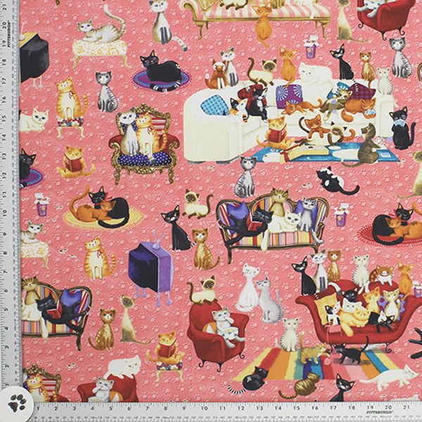 Cat Lounge Party-Pink Print Fabric is a party of playful kitties lounging and partying on