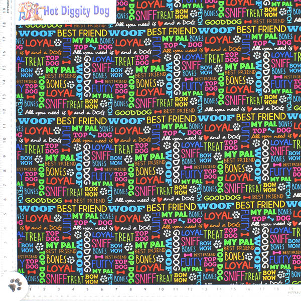Dog Lover Words Print Fabric by the Yard is a colorful collection of loving ways to refer to man’s best friend on a black background of all cotton fabric/44″ wide.