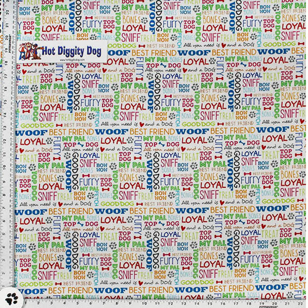 Dog Words – White Print Fabric by the Yard is loving dog words printed throughout on