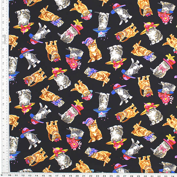 Glamorous Cats with Hats Novelty Fabric-All Cotton, 44″ wide-Black background.