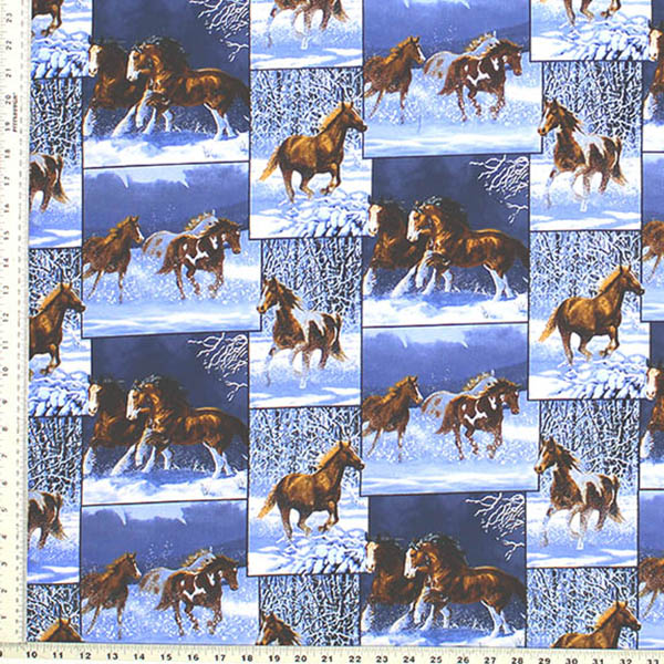 Horses in Snow Print Fabric has Horses in snowy fields and forest