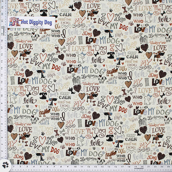 I Love My Dog Print Fabric on a light grey background of all cotton fabric with I Love My Dog throughout the