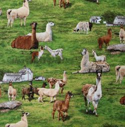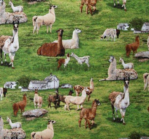 Llamas in green fields, Perfect for quilting, home decor, accessories, and clothing. Fabric by Elizabeth Studios, All Cotton, 44″ wide.
