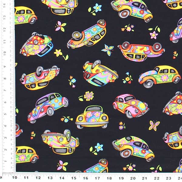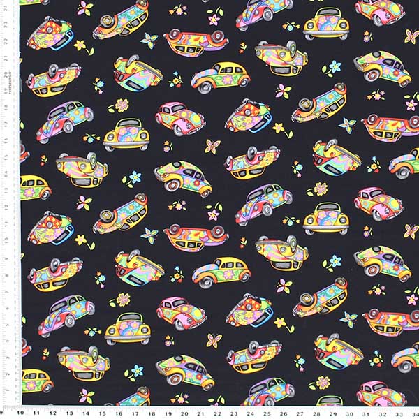 All cotton fabric is printed all over with colorful retro cars similar to lovebug-type antique cars. Black background. Made by Nutex Fabrics of New Zealand 44″ wide.