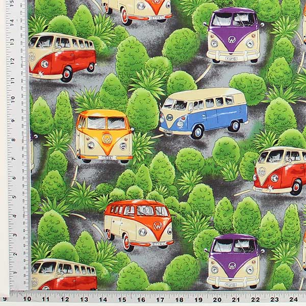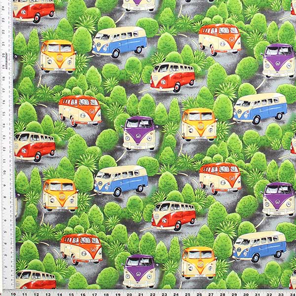 All cotton fabric is printed all over with colorful retro microbus cars similar to lovebug-type antique cars. Black background. Made by Nutex Fabrics of New Zealand 44″ wide.