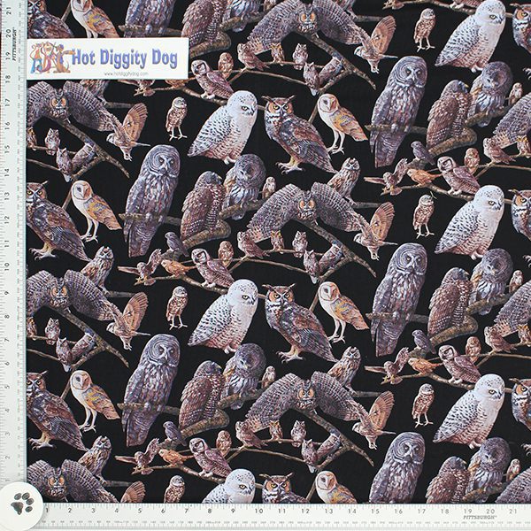 Owls Galore Fabric by the yard. A dark night scene with Owls in the trees printed on black All Cotton Fabric, 44″ wide. Manufactured by Timeless Treasures Fabrics.