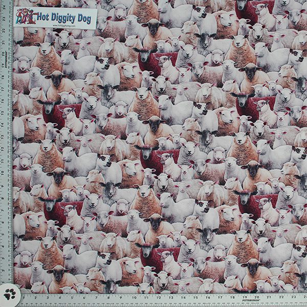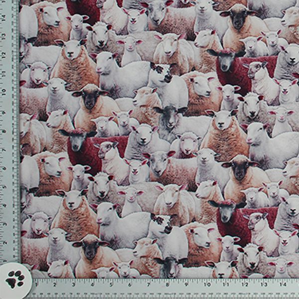 Packed Sheep Print Fabric has a crowd of sheep huddled together a total cover of the background