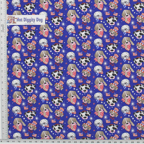 Patriotic Dogs Print Fabric by the yard. Dogs wearing American Flag Fabric bandanas and hats on a blue background with small stars and flags throughout.