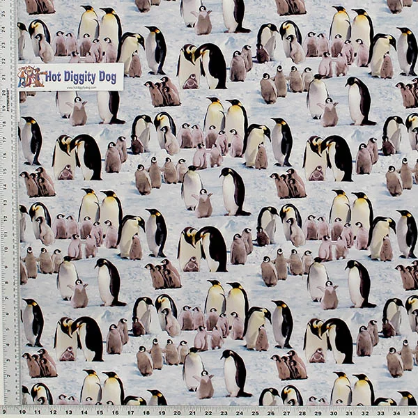 Penguins Family Print Fabric has families of Penguins huddled together snow & ice background