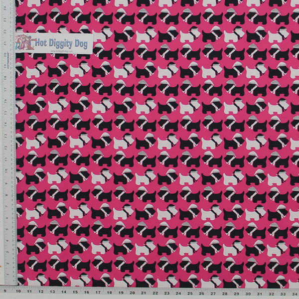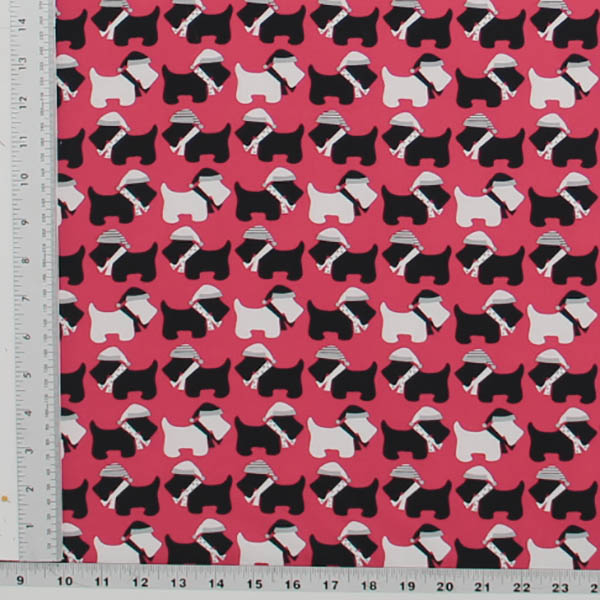 Scottie and Westie Print Fabric has black Scottie and White Westie dogs on a red background