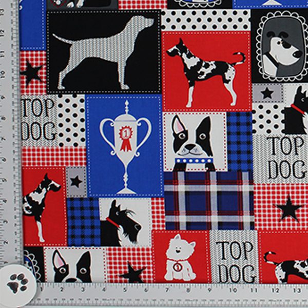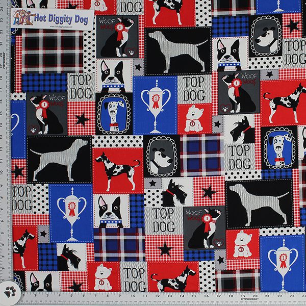Top Dog Black Print Fabric has a Quilt look of winning show Dogs on a black background