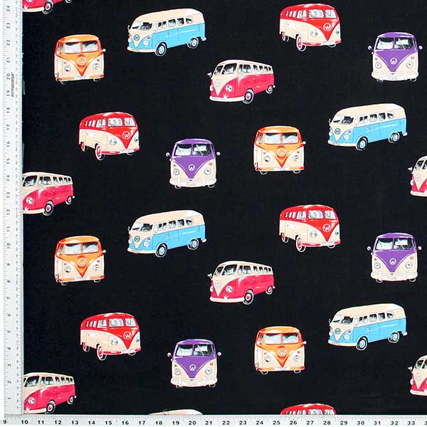 Volkswagen Bus VW Microbus Black Print Fabric has nostalgic VW micro-buses